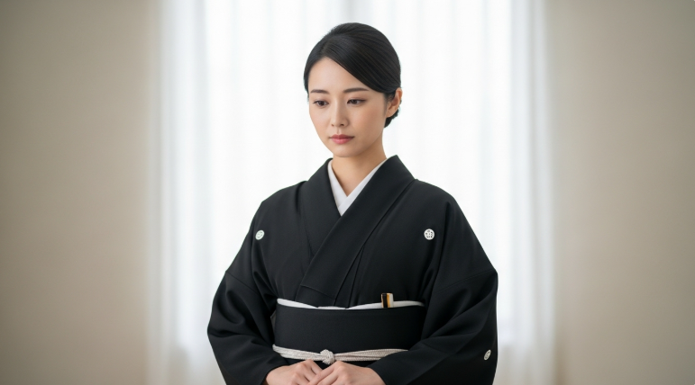 清潔感と控えめさを意識したスタイルで、喪服や場の雰囲気にしっかりなじみます。